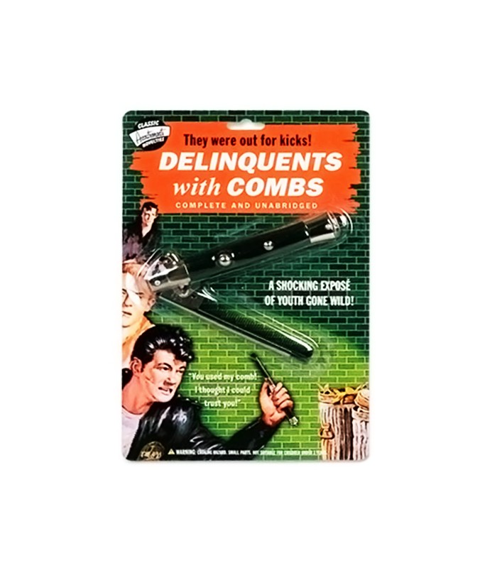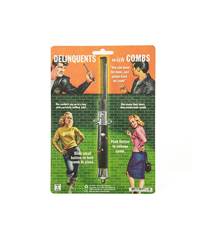 Each of these 9 (22.9 cm) long (when open), metal and plastic switchblade combs snap open with the push of a button and also features a safety lock to prevent unexpected deployment. Illustrated blister card.
