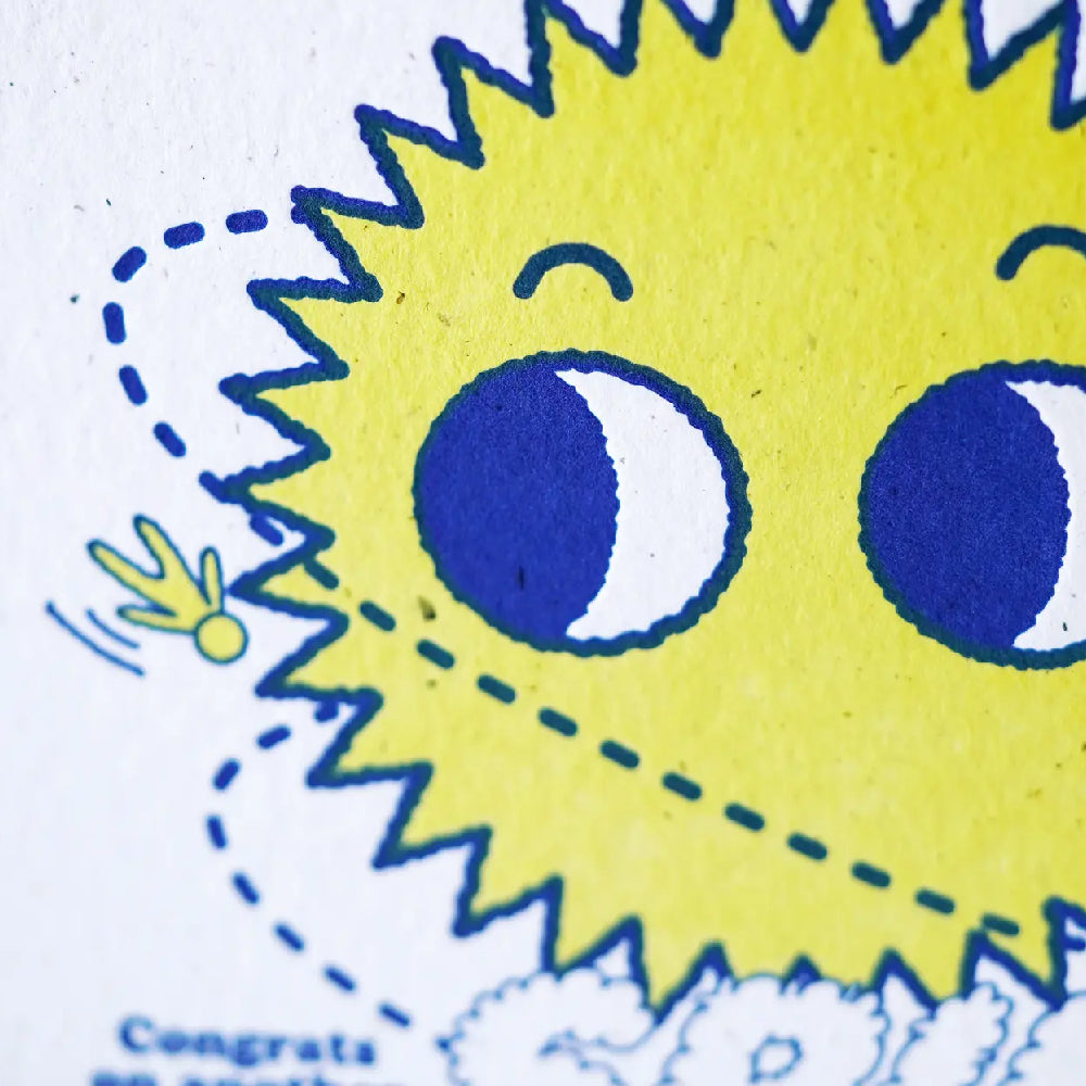 This bright and cheeky birthday card features a googly-eyed sun doing its yearly orbit—just like you. Designed for smiles and printed with care, it's a fun way to say happy birthday to your favourite human.