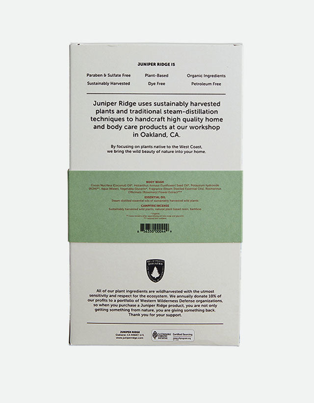 Body Wash – Cocos Nucifera (Coconut) Oil*, Helianthus Annuus (Sunflower) Seed Oil*, Potassium hydroxide (KOH)**, Aqua (Water), Vegetable Glycerin*, Fragrance (Steam Distilled Essential Oils), Rosmarinus Officinalis (Rosemary) Flower Extract*** *organic, **none remains after saponifying oil into soap and glycerin, ***natural anti-oxidant Essential Oil – 100% wildcrafted, steam-distilled Fir and Pine essential oils Incense – Sustainable harvest plants, natural resin*, bamboo. *plant based