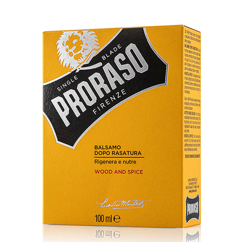 Proraso After Shave Balm Wood & Spice gives a whiff of a harmonious and comfortable mix of cedar. With a touch of Mediterranean citrus that gives a warm fuzzy feeling oozing with freshness The quick-absorbing formula regenerates the skin after the mechanical action of the razor, helping the skin to regain its hydrolipidic balance. The active hydrants and nutrients make the skin more elastic, smoother and softer, diminishing any tension, irritation or dryness. The skin becomes more even, compact and less shiny. The aroma has been proportioned to leave an enjoyable nuance that lasts without being invasive. Cologne can be used after the balm to strengthen the aroma.