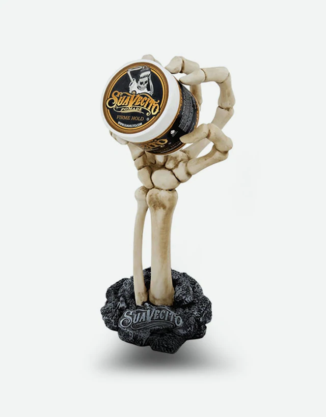 Show off your favorite Suavecito Hair Pomade proudly with this unique display. This Skeleton Hand Display is perfect for the barbershop or standing alone in your bathroom.
